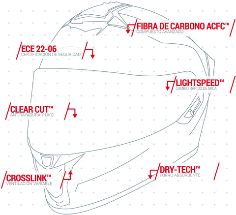 Cumple y excede la certificación ECE 22-06 e incorpora visor solar interno, mica Clear Cut™ resistente a rayaduras y rayos UV, sistema de cambio rápido Lightspeed™, ventilación Cross Link™ regulable y cierre Air Lock™